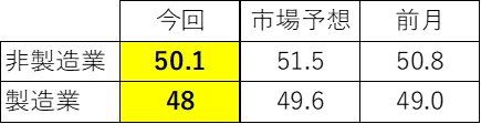 ・予想51.5に対し50.1ポイントで市場予想を下回る。