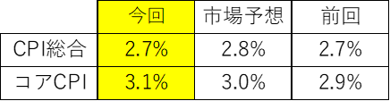 米労働省が発表した、今回の消費者物価指数(CPI)は、前年同月比で2.7%上昇。前月の2.7%から横ばい。市場予想2.8%を下回る。
