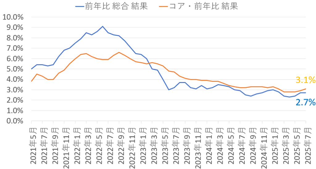 CPIは主に都市部を調査対象としており、食料品やエネルギー、自動車や家具などの財、輸送・医療サービスなど約200品目の価格変動を集計している。全ての品目を含めた指標をCPI総合(あるいは単にCPI)と呼び、価格変動が大きい食料品やエネルギーを除いた指標をコアCPIと呼びます。