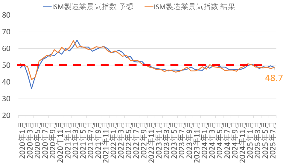 米供給管理協会(ISM)が発表した8月の製造業景気指数は48.7と、前月の48.0を上回る。この指数は、活動の拡大と縮小の境目を示すもので、50を下回ると経済全体の縮小を意味します。