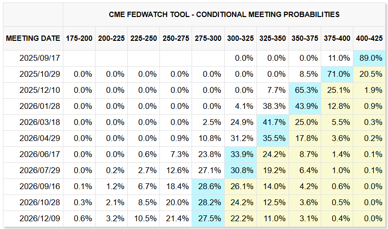 ↓9月7日時点でのCME FED WATCH 9月利下げ0.25%優勢。89%