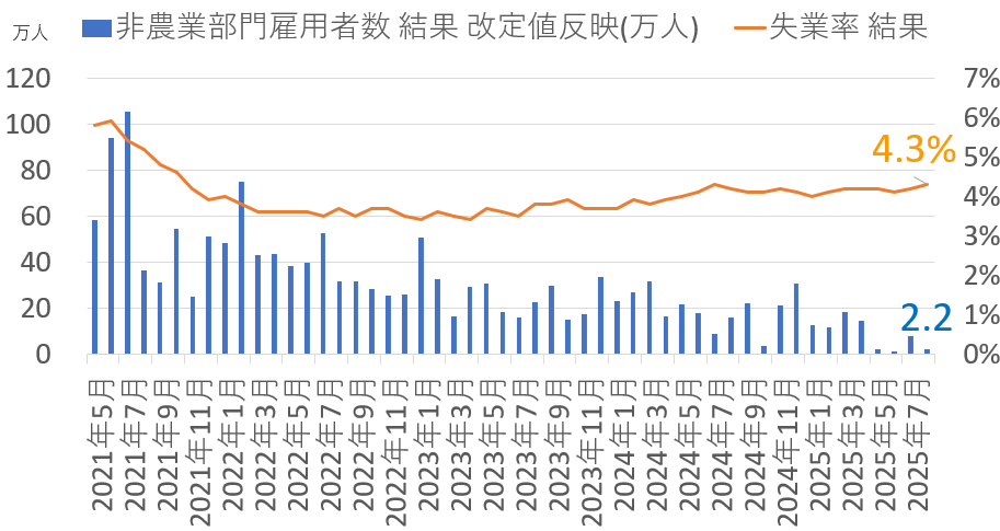 2025年8月の雇用統計です。2025年9月5日発表 主要なポイントは以下の通りです。
