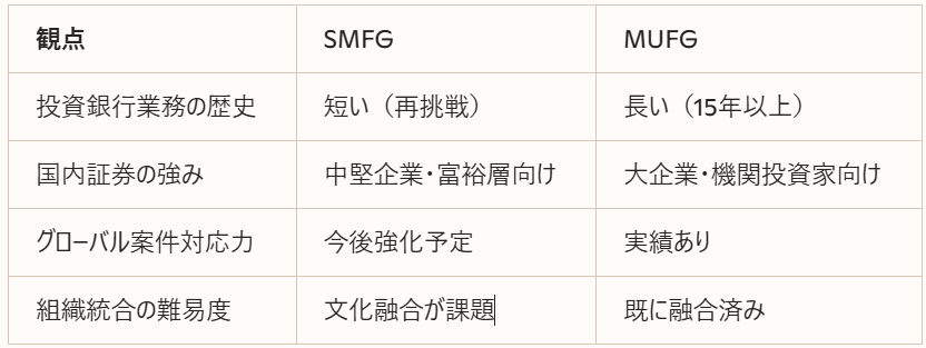 つづいて、三井住友FG(SMFG)と三菱UFJフィナンシャル・グループ(MUFG)の投資銀行戦略を比較します。