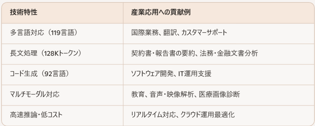 - Qwen3-Omniは音声・画像・動画にも対応し、教育現場でのリアルタイム翻訳や教材生成に活用。