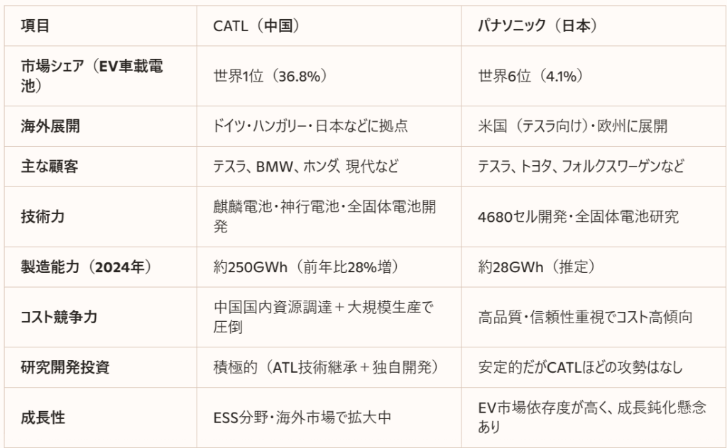つづいて、2025年時点でのCATLとパナソニックの競争力比較です。EVバッテリー市場における両社の立ち位置を、技術力・市場シェア・戦略・財務面から整理しました。