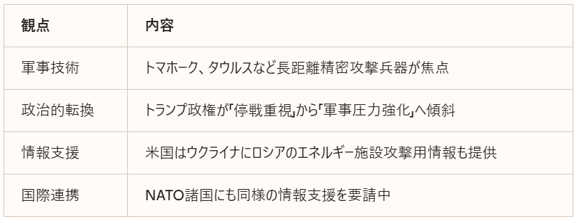 - ウクライナは以前から、ロシア本土の軍需拠点や都市を攻撃可能な長距離兵器(例:トマホーク巡航ミサイル)の供与を米国に要請してきた。