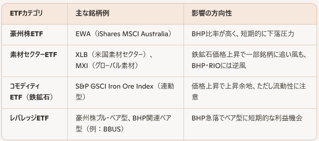 - ETF戦略への示唆:資源価格の変動は、コモディティ関連ETF(例:鉄鉱石、豪州資源株)やレバレッジETF(例:BHP関連のSOXSなど)に影響。短期的なボラティリティ上昇に備えたヘッジ戦略が有効。