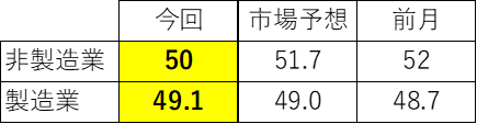 → 大幅な減速。企業の需要が鈍化。 - 事業活動:49.9(前月55.0)
