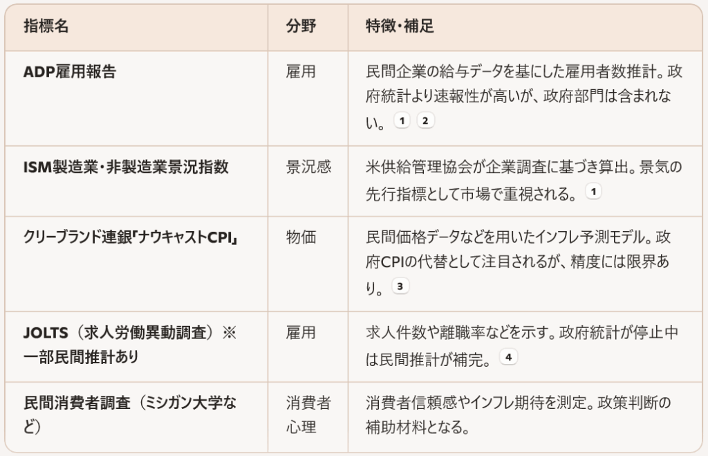 FRBが政府統計の代替として注目している民間経済指標には、ADP雇用報告、ISM景況指数、クリーブランド連銀のナウキャストCPIなどがあります。