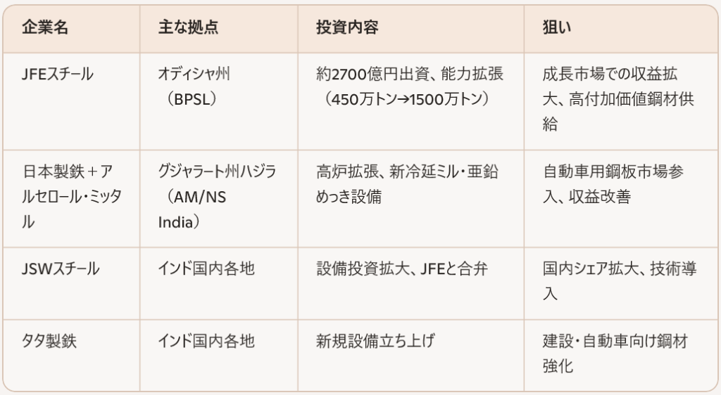 まるで各社がインド市場に「布陣」を敷き、未来の鉄鋼覇権を争う構図ですね。