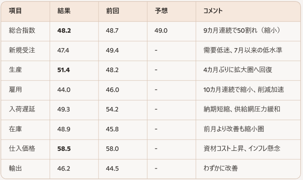 - 縮小の長期化:総合指数は9カ月連続で50を下回り、米製造業が長期的な低迷局面にあることを示唆。
