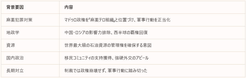 この動きは、麻薬取引容疑、米国の対中・対ロ戦略、石油資源、そして米国内政治など複数の要因が絡んでいます。