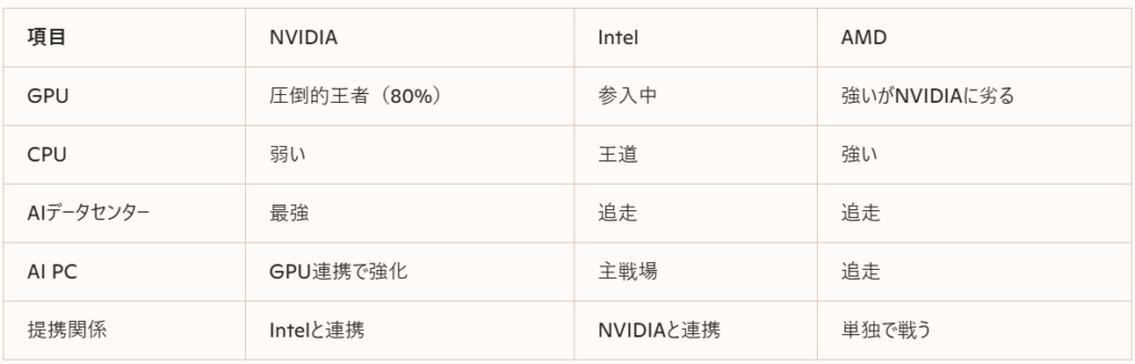 👉 インテルもAMDも、GPU・AIではNVIDIAに追いつけていない。