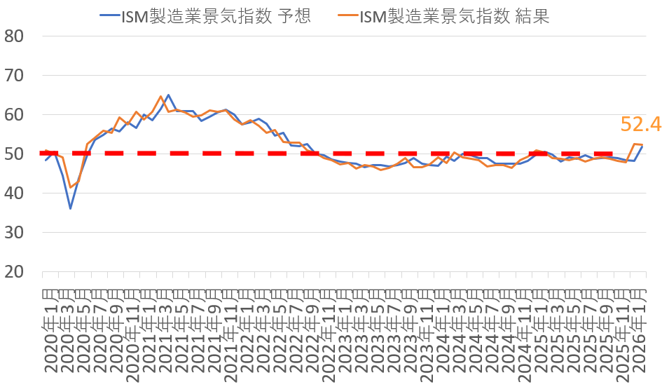 指数の「50」が景況感の分岐点です。52.4という数字は、製造業が引き続き**拡大(拡大ペースの加速)**していることを示しています。